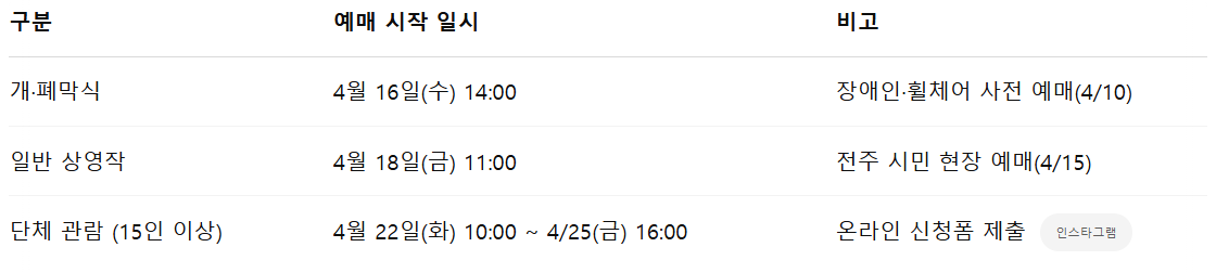 일반 상영작 예매 : 4월 18일(금) 11:00 - 전주 시민 현장 예매 (4/15)